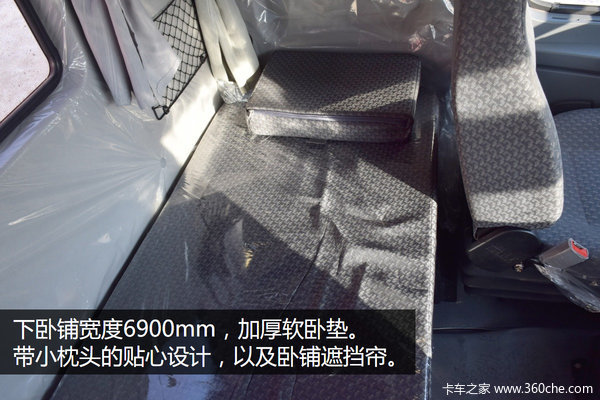 下卧铺宽度6900mm,加厚软卧垫。带小枕头的贴心设计,以及卧铺遮挡帘,为驾驶员营造安静的休息空间。上卧铺还带有防滚杆,提高上铺人员的安全性。