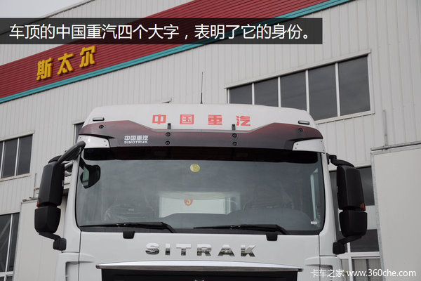 顶部的中国重汽四个大字,表明了该车的身份。两侧装有示廓灯,在夜间起到提醒对方车辆的作用。