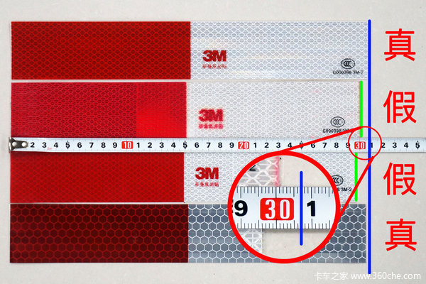 正品反光贴的长度为30.7cm(±2mm)左右,而假货通常为30cm或更短,用尺子量一下就能看出来了。