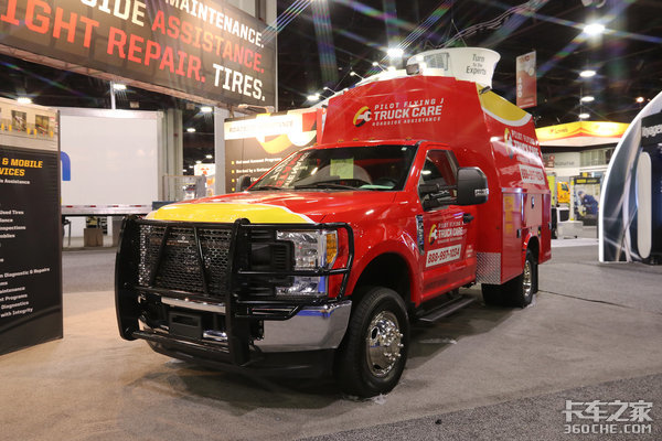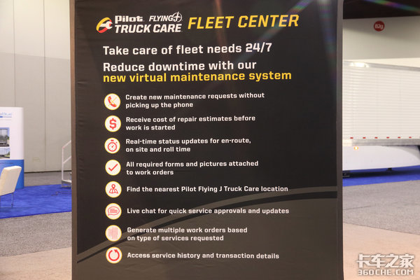 在摆放的广告牌上,Pilot Flying J也做出了一些他们作为卡车维修业务的优势介绍,比如他们提供了全天候24小时的道路救援服务,最大化的较少用户车辆在路上的抛锚时间;免除电话预约、预估维修的金额提高报告给客户、用户可以随时了解维修车辆到达以及维修的时间等等。