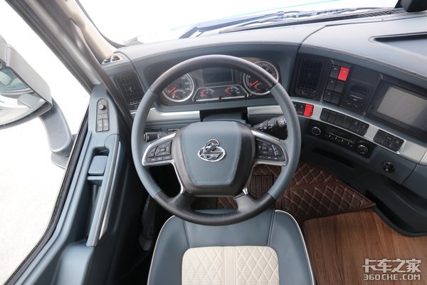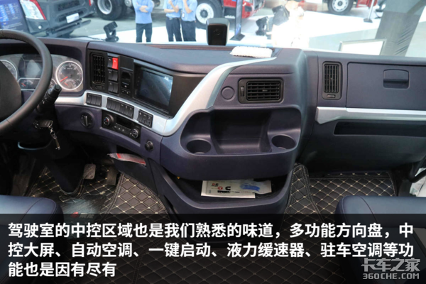 驾驶室的中控区域也是我们熟悉的味道,多功能方向盘,中控大屏、自动空调、一键启动、液力缓速器、驻车空调等功能也是因有尽有,在这里也就不过多赘述。