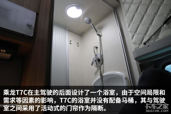 乘龙T7C在主驾驶的后面设计了一个浴室,由于空间局限和需求等因素的影响,T7C的浴室并没有配备马桶,其与驾驶室之间采用了活动式的门帘作为隔断。