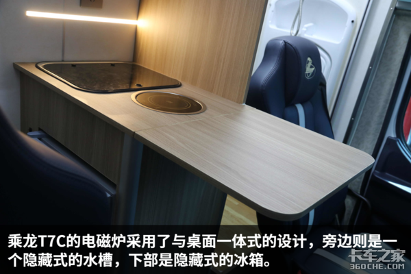 乘龙T7L休息区自带一个折叠式的电磁炉,卡友们在驾驶室就可以完成做饭,而且做饭的区域也可以作为餐桌来使用。