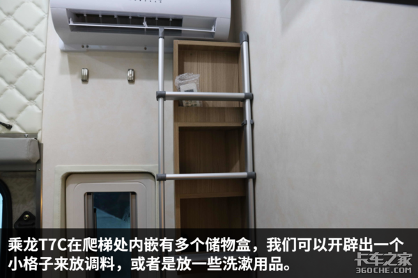 而乘龙T7C的车载冰箱采用了隐藏式的设计,位于水槽旁边。乘龙T7C在爬梯处内嵌有多个储物盒,我们可以开辟出一个小格子来放调料,或者是放一些洗漱用品。