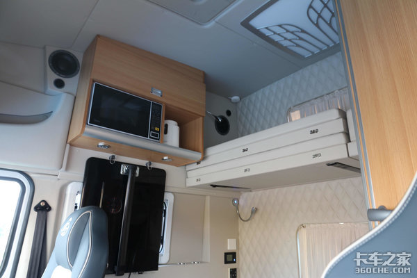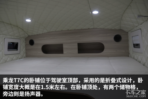 乘龙T7C的卧铺位于驾驶室顶部,采用的是折叠式设计,卧铺宽度大概是在1.5米左右。在卧铺顶处,有两个储物格,旁边则是扬声器。很多卡友比较担心起床时碰到头顶,其实卧铺的空间比比火车卧铺的空间还要大,而且为了防止身体被撞伤,卧铺周边都采用了软包的设计。