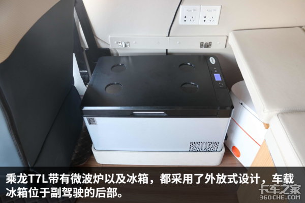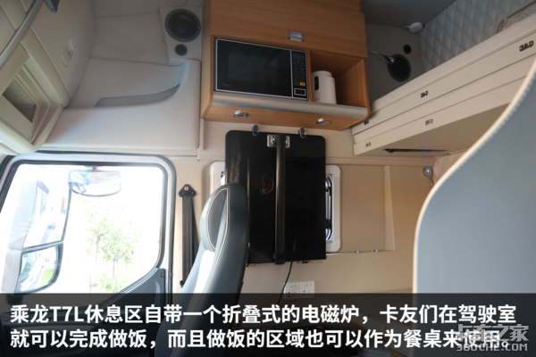 乘龙T7L带有微波炉以及冰箱,都采用了外放式设计,车载冰箱位于副驾驶的后部。微波炉和储物空间位于电磁炉上部,存取东西更为方便。