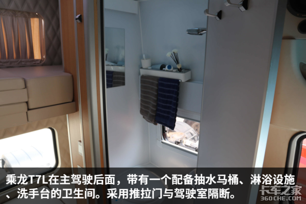 对于洗手间的设计两款车型也有区别,乘龙T7L在主驾驶后面,带有一个配备抽水马桶、淋浴设施、洗手台的卫生间,不仅可以方便卡友洗澡,同时也可以为卡友应急解手使用。洗手间和驾驶室采用了推拉门的设计隔断开来,十分方便。