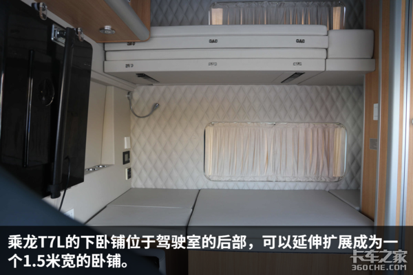 乘龙T7L的下卧铺位于驾驶室的后部,可以延伸扩展成为一个1.5米宽的卧铺,满足夫妻之间休息的需求。父子、兄弟一起开车,则对卧铺的数量比较看重,需要双卧铺的设计,乘龙T7L也可以满足这类卡友的用车需求。