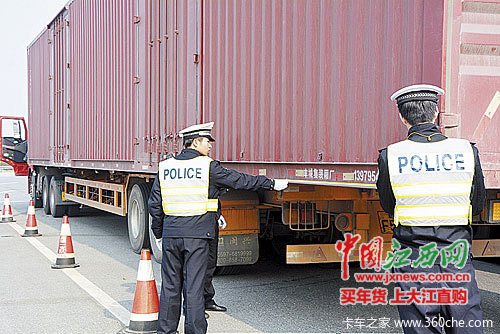 1月9日上午,在南昌昌西南收费站,高速交警对货车安装防护装置的情况进行集中检查,记者随警进行了采访。一辆车牌号为“赣C3830挂”的大型货车被交警拦下,从外形上看虽然在车子后、侧位置都安装了安全防护装置,可是当交警拿出标尺进行测量时,问题就出来了。按照规定,后防护装置离地高度不大于55cm,可是该车的后防护装置达到60cm,安装明显不规范。后对行驶证进行例行检查时,却发现该车属于未年检上路。