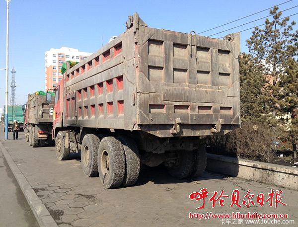 在呼伦贝尔市本市车管所大院,成群结队待检车辆中无一辆大货车车厢超高。