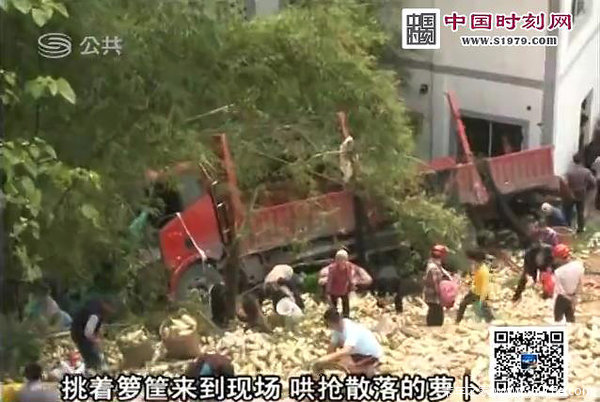 大货车上装载的是几千斤萝卜,不少附近的村民背着背篓、挑着箩筐来到现场,哄抢散落的萝卜。