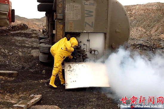 根据现场情况,瓜州中队在事故点上下一公里处设立警戒带实施交通管制,官兵深入事故地点进行现场侦查,经侦查发现,槽车罐体前段右侧发生泄漏,正“嘶嘶”往上冒着白烟,随时有发生爆炸的危险。