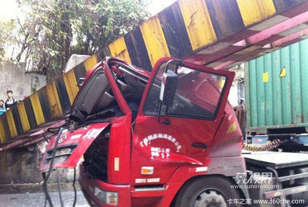 记者赶到事发现场的时候看到,标志着“4.2米”的限高栏已经坠落,压在一辆货柜车车头上面,而货柜车车头,也就是驾驶舱的位置已经完全变了形,车头的挡风玻璃更被整块抛出车外,车内杂物和玻璃散落一地。