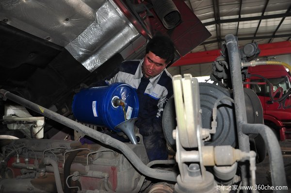 2015年3月,石家庄辛集的河北合利汽车维修服务站,车主位松师傅行驶里程达到95214KM的欧曼GTL超能版进行了首次发动机保养,因为是跑从河北到新疆、广州的长途,为了运输方便,提前了四千多公里做保养。