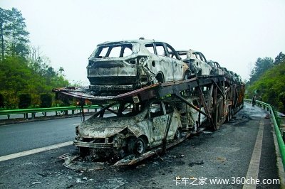 驾驶员王某驾驶号牌为渝AN5816/渝A3589挂的重型箱式半挂车,满载着16辆商品车准备运往福建泉州,行至沪渝高速公路马尾井隧道时,发现车辆第五轴轮胎浓烟滚滚,他迅速停车发现轮胎已经起火,由于火势较大,瞬间吞噬了挂车上的多辆商品车,14辆“福特”牌新车被烧毁(见上图),损失达到220万元。