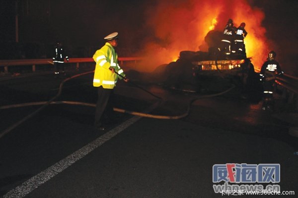 5月19日晚,一辆满载着500条大型轮胎的重型半挂货车驶出威海市区后,于当晚7时许在威青高速突然发生自燃。经过交警、消防、高速路政等部门的全力救助,大火虽然被扑灭,但车上的500条轮胎基本报废。至昨日凌晨2时许,封闭了7个小时的高速公路恢复畅通。