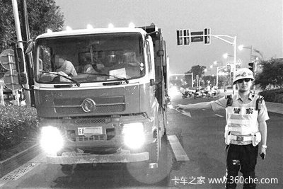 5月25日夜间,南京交警二大队邹亨警官巡逻至城西干道水西门路口处,发现一辆重型自卸货车由南往北行驶,由于天色昏暗,他以为是辆渣土车。根据渣土车管理办法,渣土车作业必须列队出行,邹警官便上前准备检查。距离接近后,邹警官一愣,这分明是一辆环卫车,蓝白相间的车头是典型标志。不过,再一细看,邹警官发现了问题,尽管该车车身颜色跟环卫车一模一样,可在车型上略有不同,而且这辆车顶上还加装了灯。