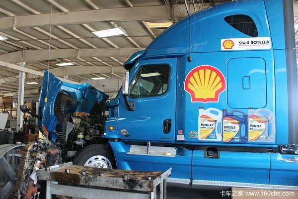 拆解现场在福莱纳的“4S店”,姑且这么称呼,因为这个店是集销售服务等功能于一体的店。在中国,这种规模的店是4S店无疑。从上方的LOGO来看,该店同时也是康明斯发动机、艾里逊变速箱、卡特彼勒等总成厂家的服务站。店内业务很好,工位很多,而且工位上停满了来保养和维修的卡车。说明美国卡车用户还是比较信赖厂家的直营店,也消费得起厂家的服务。