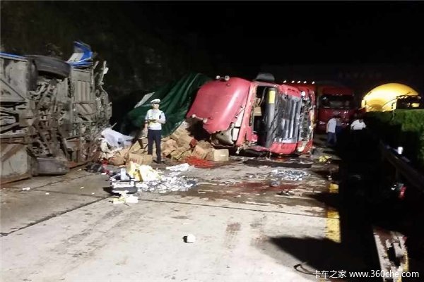 2015年9月11日零时16分许,大广高速公路2300km+400m西半幅处,一辆牌照为赣AC**97由郑州发往南昌的大型客车在行驶途中,由于前方一辆牌照为豫N18**9运送酒糟的半挂货车酒糟洒落,引起路面湿滑突然发生侧翻,一辆牌照为皖KG8**5的半挂货车又与大客车追尾相撞,造成9人当场死亡。
