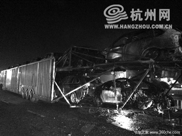 晚12点左右,我赶到紫金港路西溪天堂附近的起火现场,发现装载新车的是一辆大型集装箱车,装了十六辆宝马车,车型主要是宝马X5和I3。