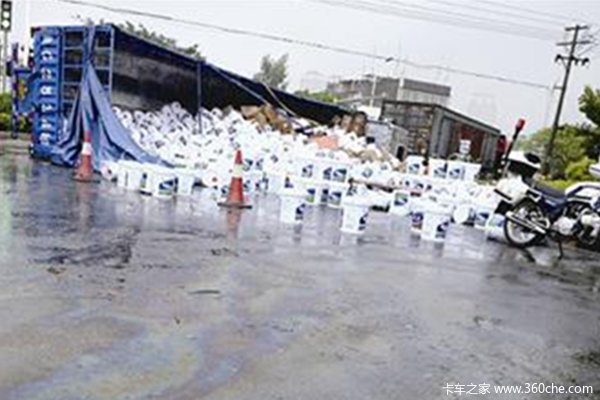 这部平板拖挂车由孚莲路右转到东孚大道时发生侧翻,后斗的上千只白色油桶倾倒而出,路面上白花花一片,占据了10多米长的道路;还有一些外包为纸皮装的瓶装机油。其中白色桶装的是液压油,一桶13公斤。