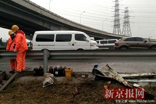 上午9时许,记者来到事发现场,被夹击的小货车和后方的大货车已被清障车拖走,一辆河北牌照的大货车停在五环外侧车道,道路养护人员正在清理现场。