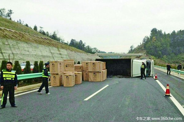 据黔南高速交警大队惠罗高速辖区的交警中队民警称,侧翻的货车横躺在公路中央,散落的货物狼藉一地,将两条行车道全部占据。