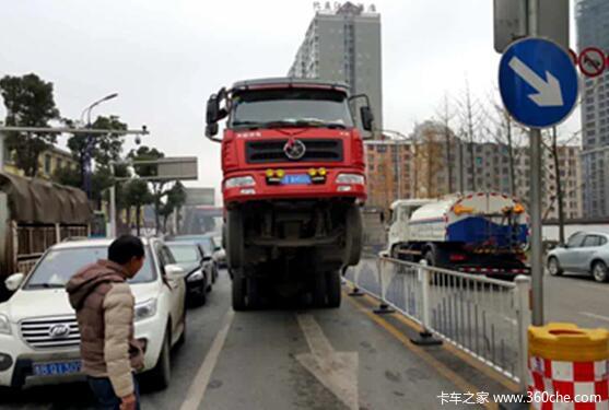 2015年12月3日,在六盘水城区凉都大道市一中附近的红绿灯处,一辆满载建筑钢管的大货车在等待绿灯时,由于拉得太重钢管向后倾覆,货车失去平衡车头高高扬起。