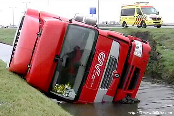 【卡车之家 原创】俗话说常在河边走哪有不湿鞋,这不也有一辆雷诺卡车一头栽进了路边的小水沟。万幸的是车身只是侧翻,水沟底部的淤泥起到了一个缓冲作用,车辆受损不大。但是如何将这辆带着冷藏半挂的雷诺卡车从水沟里弄出来呢?