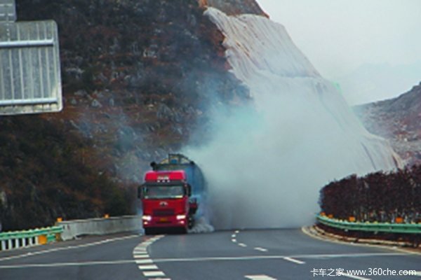 1月4日11时14分许,六盘水高速交警陡箐中队的民警,巡逻至杭瑞高速水城县境内1879KM处时,发现一辆拖着长长烟雾的大货车。“其冒出的浓烟,笼罩了身后近百米远的路段,什么也看不见。”民警说,他们以为是着火了,于是迅速找好适当位置,将其拦停。