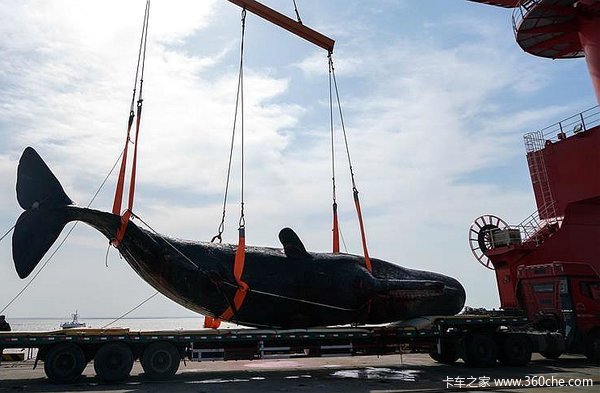 在2月14与15日,在江苏苏北沿海的如东海滩先后发现了两头搁浅死亡抹香鲸,有趣的是部分人还有情人节抹香鲸殉情的猜想,不过事实证明全是雄性;在16日打捞上的一头长约16米,重量在25吨以上,上岸之后是靠一辆解放的平板卡车进行转运的,真没想到抹香鲸都离不开大件运输车。