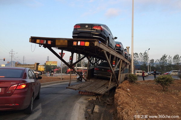 【卡车之家 原创】网传“3月19日京珠高速爆炸发生后,消防官兵开铲车将占用应急车道的车铲下高速,保险不赔钱”,是假的!其实是一辆运二手车的轿运车翻了。