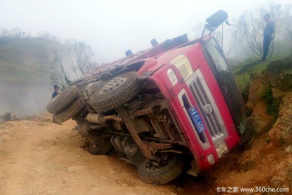 在5月10日的帖子中,“AEL608”讲述了自己的翻车经历。当时车上满载木头行驶在山道上,路面有一定坡度,经车主讲述当时因为路面被水冲空了,并且没人走过,表面看上去是好的,但走到这里就掉入了“陷阱”当中,由于装载了12吨左右的货物,车辆一方侧倾后很容易就会发生侧翻。