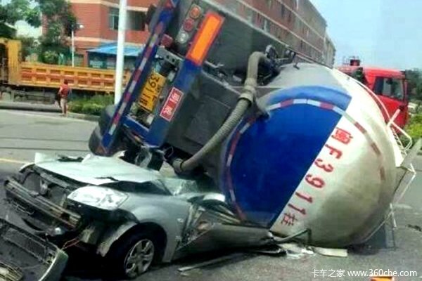 【卡车之家 原创】2016年8月29日12时45分许,福建省漳州市区内319国道与靖城大道交叉路口发生一起严重交通事故,一辆水泥罐车侧翻直接压到一辆小轿车上,小轿车当场被巨大的水泥罐砸扁,造成小轿车内4人死亡1人受伤,现场情况惨不忍睹。