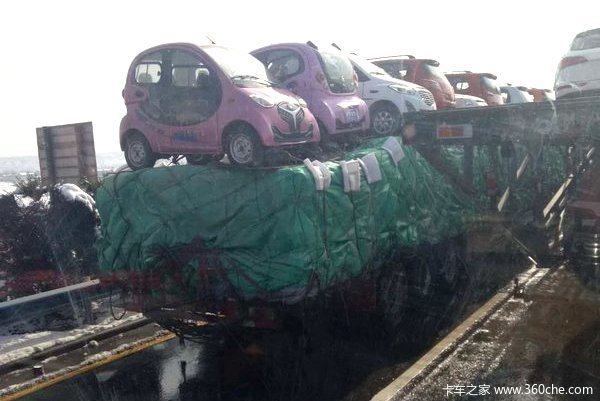 由于当时全国多地都迎来初冬的第一场雪,从图上可以看道路两边的积雪还没有融化,路面上也十分湿滑,普货加上代步车的套餐很爽吗?这辆大板上面拉的东西更有意思,我们这边把这车称为“小蹦蹦”,大冬天的这样拉多危险啊!