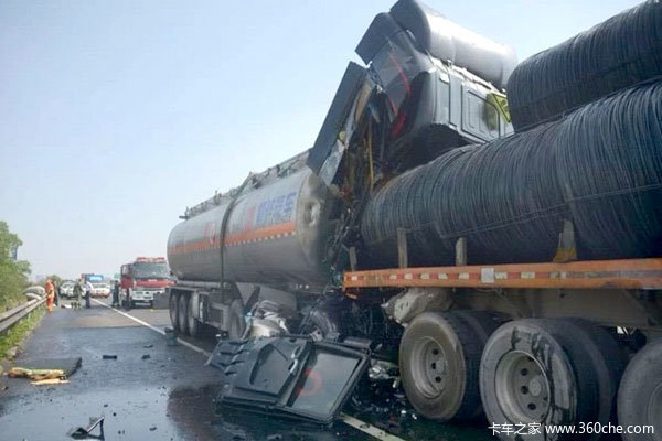 这起事故的原因比较明确,前方的重汽半挂车满载钢丝盘圆,后方的油罐车速度较快+刹车不及时,追尾了前方的重卡。但是,这起事故引发了我们很多深思。