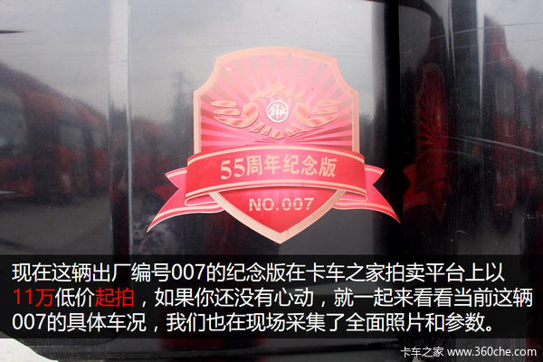 这款解放55周年纪念版J6产品,是解放为纪念解放汽车诞辰55周年推出的限量产品,全国只有1000台(实际数量也许不足百辆),侧面有着纪念版的标志编号,此次拍卖的编号007。