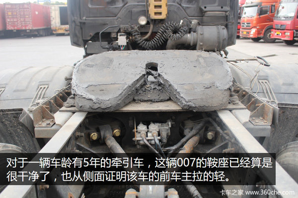 我们来看看鞍座,对于一辆车龄有5年的牵引车,这辆007的鞍座已经算是很干净了,也从侧面证明该车的前车主拉的轻。