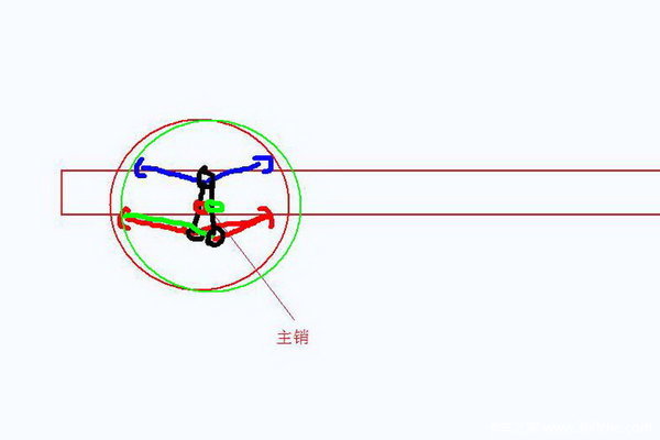 俯视图上来看上摆臂球头相对下摆臂球头要靠内且靠后,这样就构成了主销的内倾角和后倾角,主销的倾角是为了解决车轮方向自动回正。