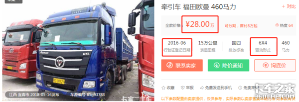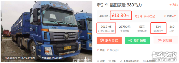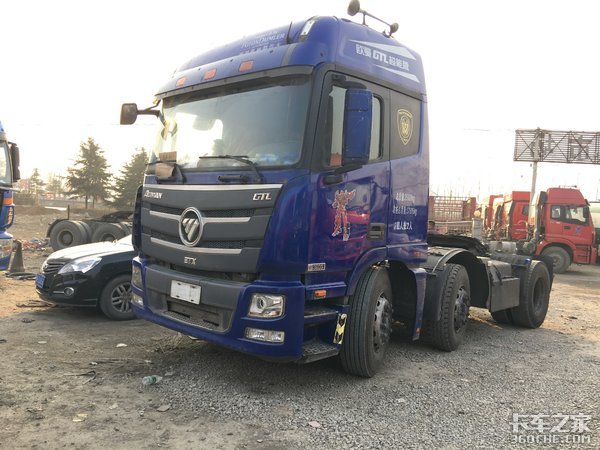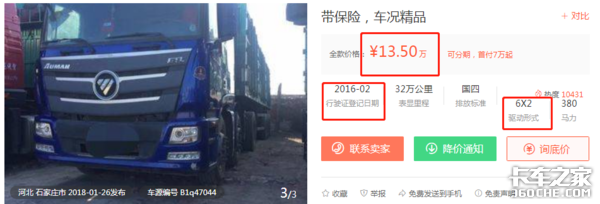 以卡家二手车网站展示的欧曼品牌为例,三款车分别是标价13.5万元的2016年2月登记的GTL 6×2牵引车,标价13.8万元的2013年5月登记的ETX 6×4牵引车,标价28万元的2016年6月登记的GTL 6×4牵引车。
