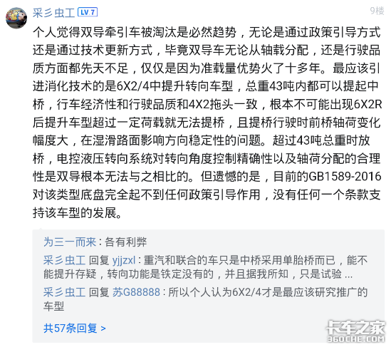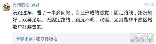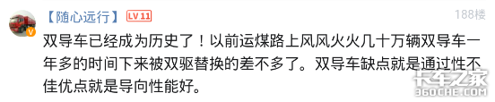 诸如以上卡友等很多人在论坛帖《同配置便宜近十万!6×2双导牵引为啥不值钱了?大家都只要双驱》的回复就非常客观,不管喜欢哪个车型,符合自己的实际情况的车就是好车!