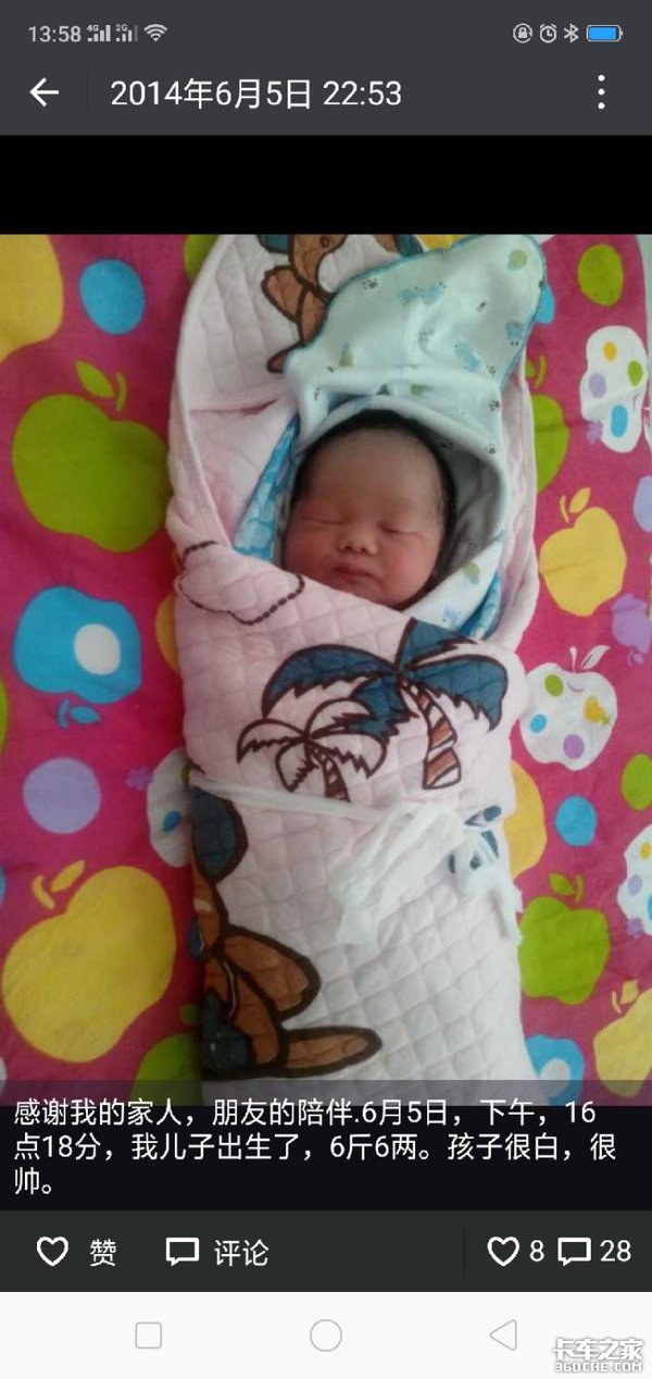 小志见到我第一句话就是:老婆,对不起,受苦了。此刻,我所有的委屈都被这一句话融化了,在眼里打转的泪水就是这么不争气的划了下来。想想这么多年,生日,情人节,产检,生孩子,所有的,他陪伴我的次数屈手可指。我们的儿子的名字叫周凡喆,寓意也很简单,看似平凡但并不平凡,喆是两个吉组成,又是囍字的一部分,代表吉祥如意。也许是养车,开车的原因总是更注重吉祥如意吧。