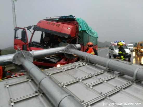 消防官兵到达现场后了解到,由于雨大风急,高速路牌被吹倒,砸到一辆行驶在高速路上的货车,车头被砸完全变形,司机腿部被卡住,情况万分危急。