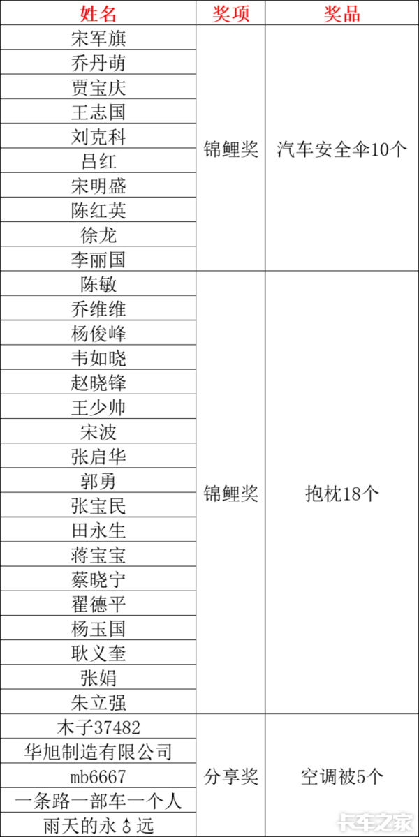 以下为中奖名单。稍后卡车之家将发送私信获取准确的邮寄地址,以便于奖品的发放!请在2月19日之前填写完毕~过期视为主动放弃。(请多多留意自己的APP——论坛——右上角小红点——私信消息)