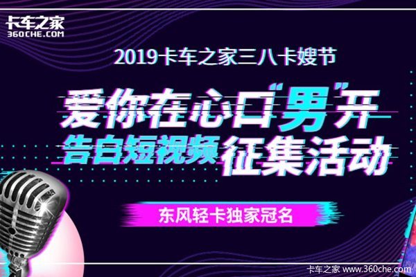 3月8日,“女神节”即将来。在这个特殊的节日,卡车之家将在3月1日发起《2019东风轻卡三八卡嫂节#爱你在心口男开#告白短视频》征集活动。抖音和快手都可以哦。