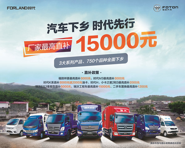 福田时代在全国范围内实行优惠补贴政策,涉及3大系列产品、750个品种,厂家最高直补15000元,真正做到了“汽车下乡,时代先行”。