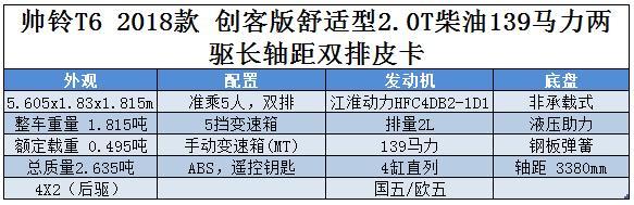 帅铃T6 2018款 创客版舒适型2.0T柴油139马力两驱长轴距双排皮卡