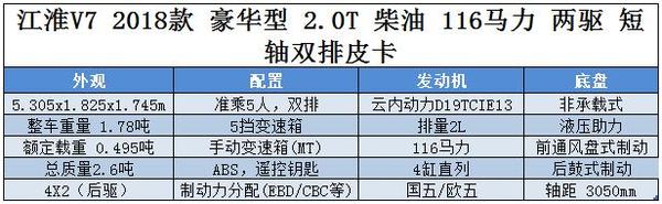 江淮V7 2018款 豪华型 2.0T柴油 116马力 两驱 短轴双排皮卡