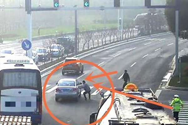 十字路口绿灯亮起时,刚刚起步的大货车突然刹车后,司机紧接着跳出车外飞身追向前方一辆缓慢行驶的小车……到底发生了什么?3月4日上午,这令人费解的一幕就发生在浙江省平湖市的一个十字路口。