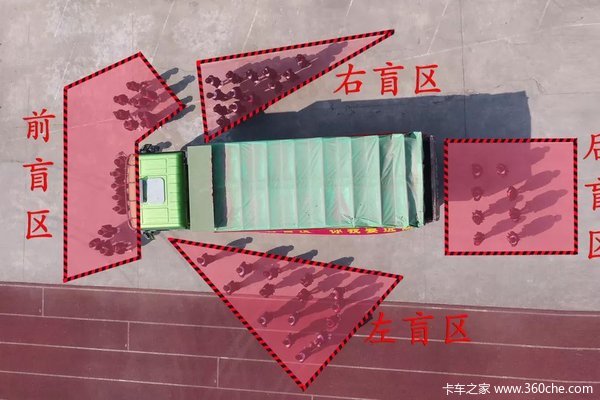车身越大盲区越大,行驶时绝对不能待在货车两侧盲区并排行驶,同时不要从右侧超越货车。